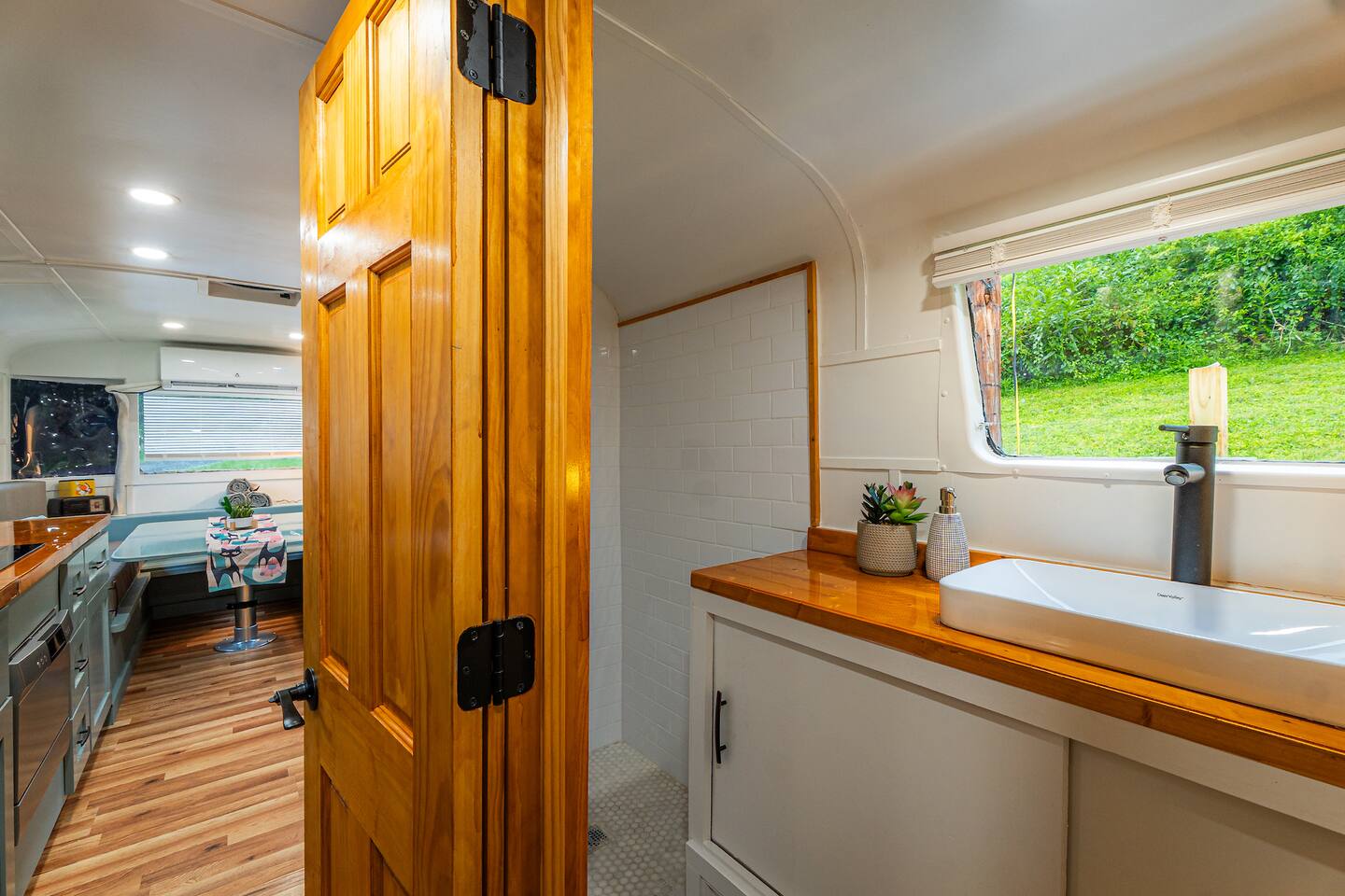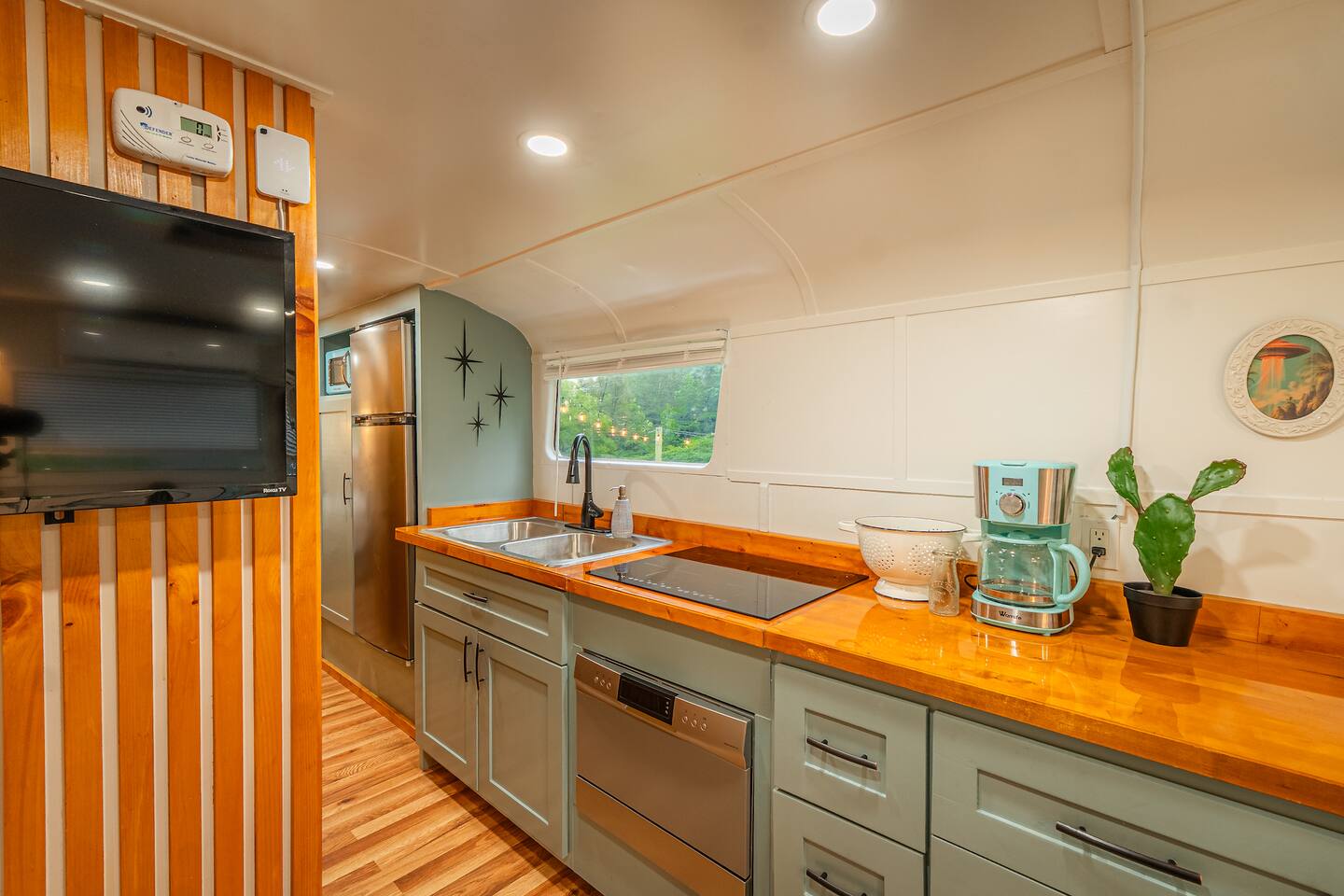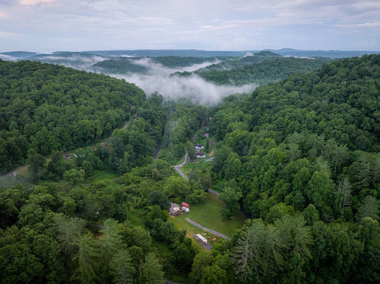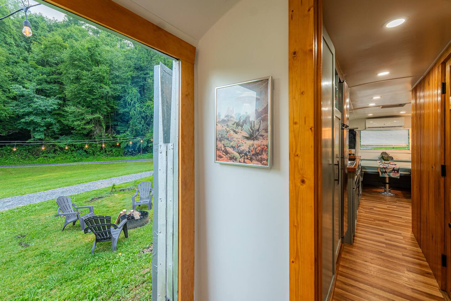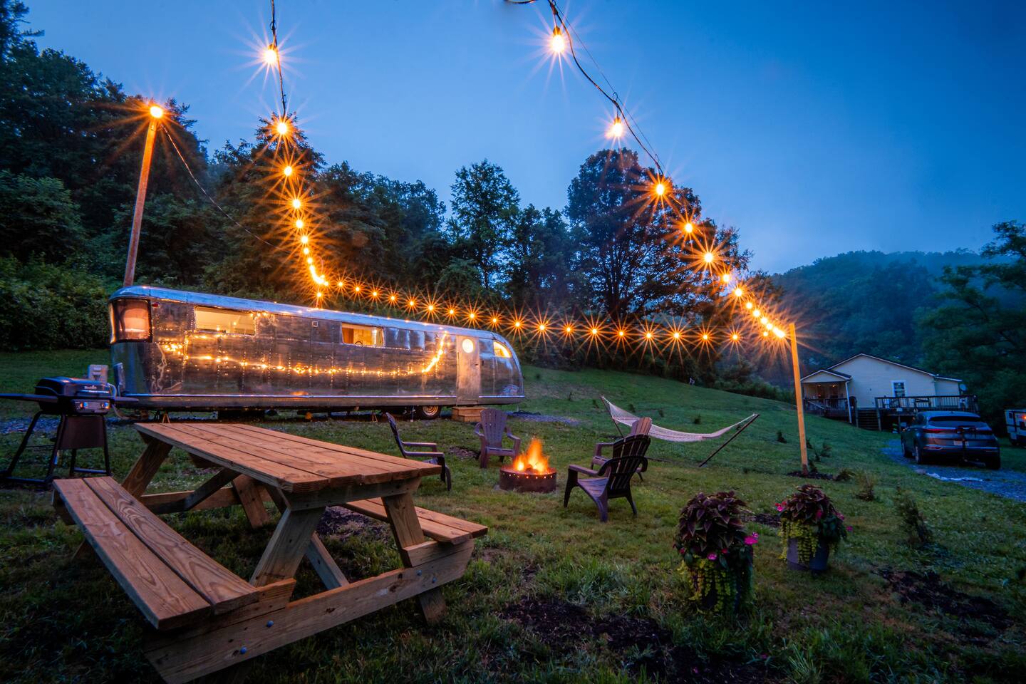 The 48 sits on its own lot about 100 feet away from the nearest house. The lot includes its own driveway, firepit, picnic table, and grill. It's tucked away at the end of our holler, the neighbors are all out of view (except our own house next door that will become the Steampunk house.) It's a very friendly neighborhood, neighbors may stop to say hi. There are also friendly free range dogs you might meet.